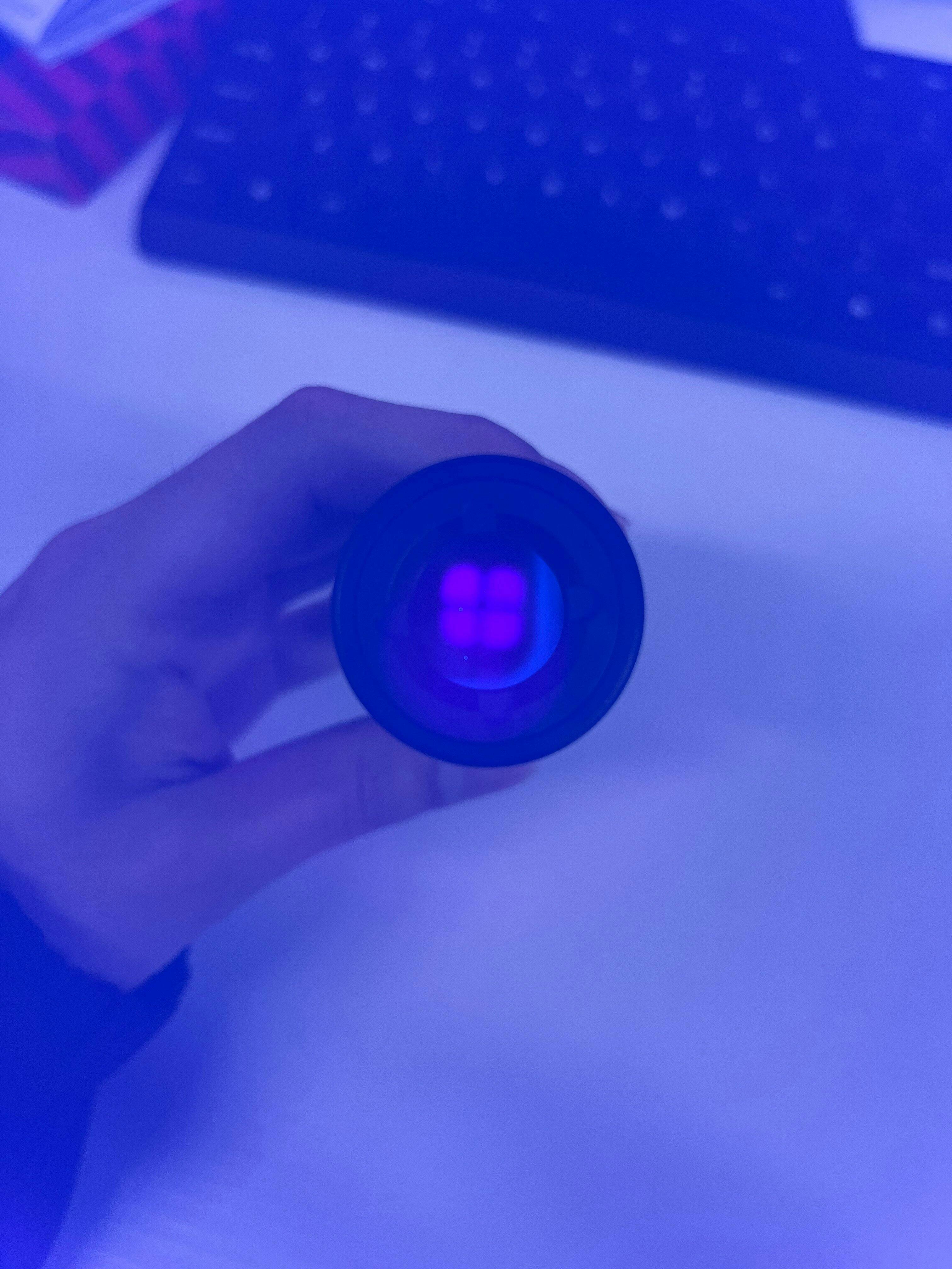 The ZWB2 filter makes a huge difference — instead of flooding everything with white/blue light, it gives a clean, pure 365nm beam. When I shine it on my skin, the texture and tiny bumps pop out instantly (you can see in the photos). With my older UV lights, I could barely tell anything was there.