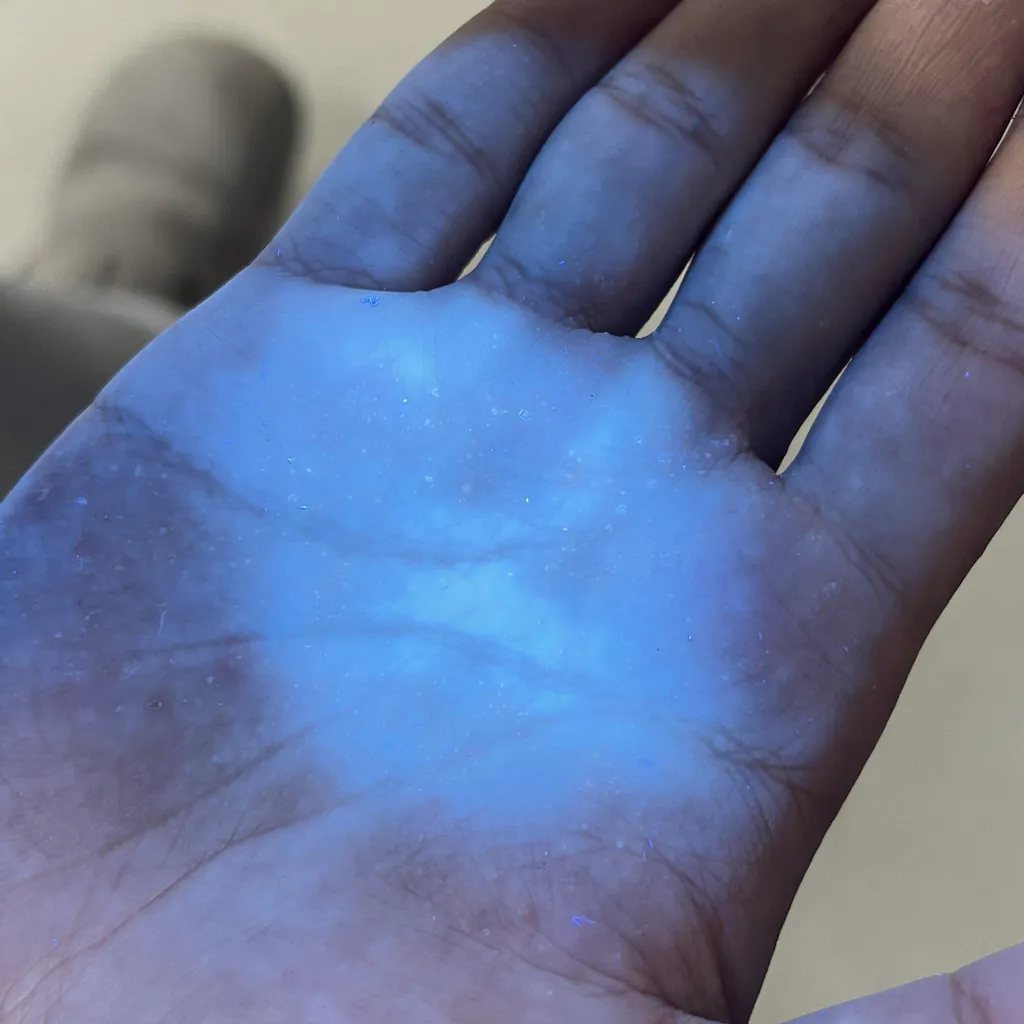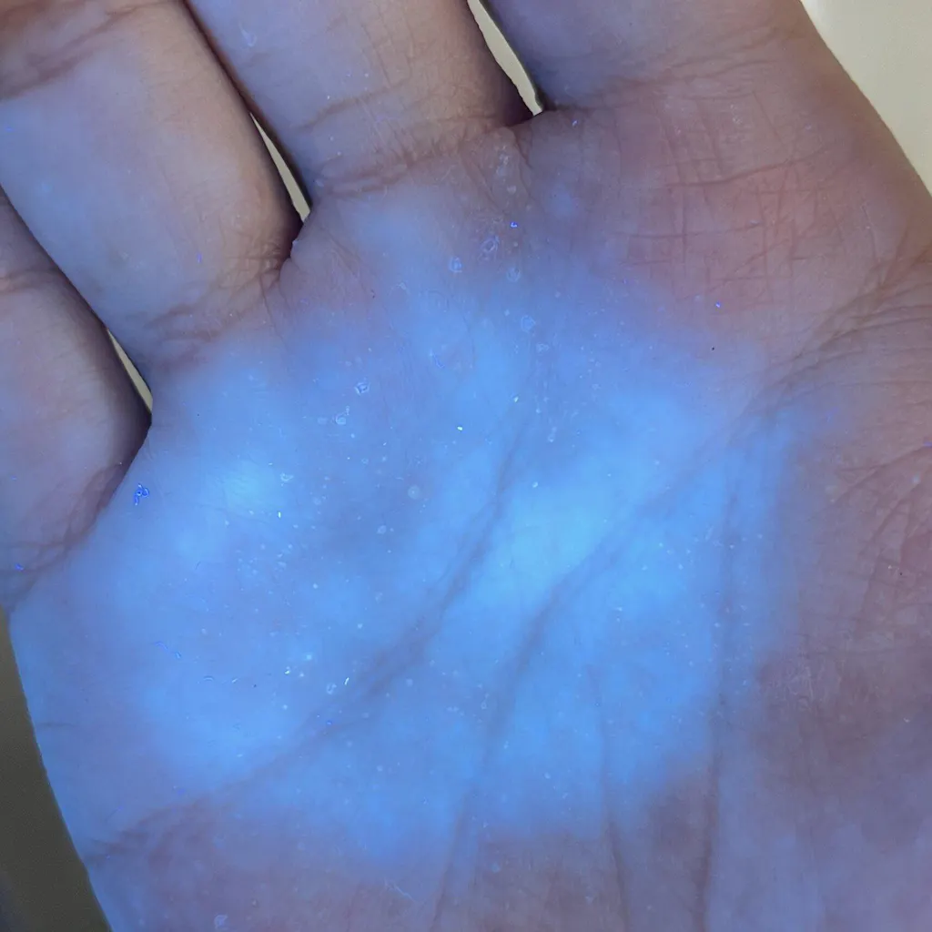 The ZWB2 filter makes a huge difference — instead of flooding everything with white/blue light, it gives a clean, pure 365nm beam. When I shine it on my skin, the texture and tiny bumps pop out instantly (you can see in the photos). With my older UV lights, I could barely tell anything was there.